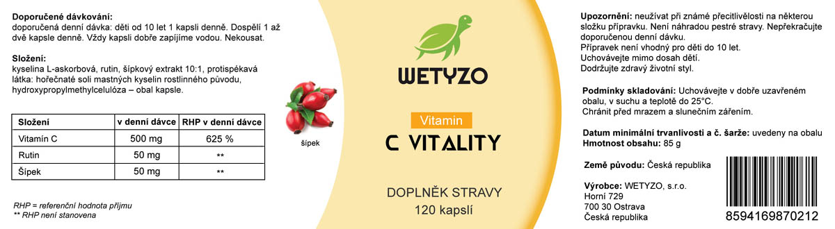 Složení: kyselina L-askorbová, rutin, šípkový extrakt 10:1, protispékavá látka: hořečnaté soli mastných kyselin rostlinného původu, hydroxypropylmethylcelulóza – obal kapsle