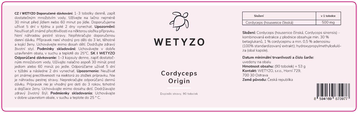 • Standardizace: ≥ 1 % cordycepinu a 0,5 % adenosinu.