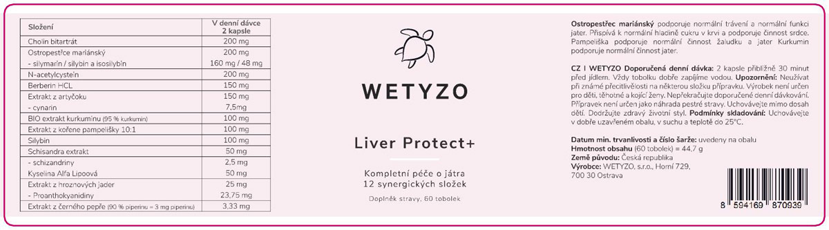 Hydroxypropylmethylcelulóza – obal kapsle, cholin bitartrát, extrakt ze semen ostropestřce mariánského (Silybum marianum) (80 % silymarinu, 30 % silybinu a isosilybinu), N-acetylcystein (NAC), extrakt z kořene dřišťálu indického (Berberis aristata) (97 % berberinhydrochlorid), extrakt z listů artyčoku (Cynara scolymus) (5 % cynarinu), extrakt z oddenku kurkumy (Curcuma longa) (95 % kurkuminu), extrakt z kořene pampelišky (Taraxacum officinale) 10:1, silybin, extrakt z plodů klanoprašky čínské (Schisandra chinensis) (5 % schizandrinů), kyselina alfa-lipoová, extrakt z hroznových jader (Vitis vinifera) (95 % OPC), extrakt z plodů černého pepře (Piper nigrum) (90 % piperinu).