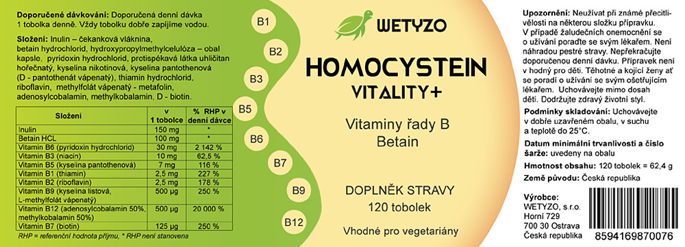 Homocystein Vitality+ s betainem je doplněk stravy vytvořený na základě spolupráce s MUDr. Karlem Erbenem a Mgr. Michaelou Verde Beitlovou, který díky vitamínům B6, B9, B12 a betainu přispívá k normálnímu metabolismu homocysteinu.